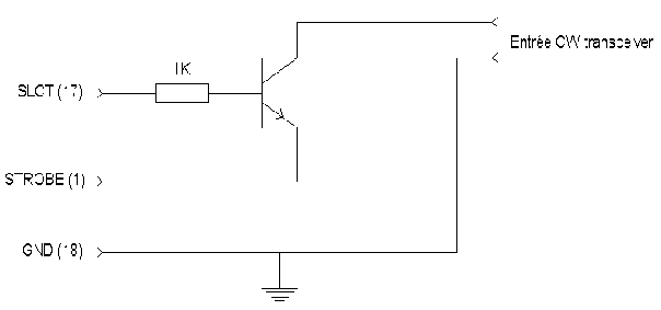 Editest peut piloter une interface CW par lintermédiaire dun des ports parallèles de lordinateur (LPT1 à LPT4). Le montage nécessite un transistor NPN quelconque (par exemple 2N2222) dont la base est reliée, par lintermédiaire dune résistance de 1000 ohms à la broche 17 (SLCT) du port parallèle. Lémetteur du transistor est connecté à la broche 1 (STROBE) et le collecteur au point chaud de lentrée CW du transceiver. La masse de lentrée CW est, quant à elle, reliée à la broche 18.